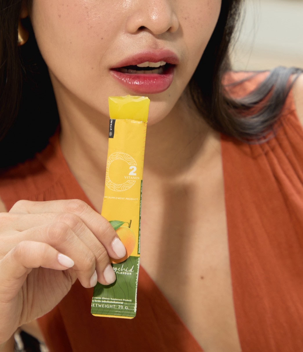 Exclusively produced in Thailand by C-Health. This jelly-format vitamin supports skin health and provides sun protection from within — like a vitamin drip for your skin, all in one convenient pouch.
